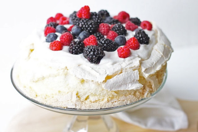 | berry-topped pavlova + coconut whipped cream — find recipe here |