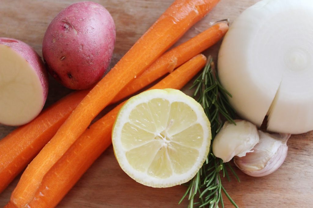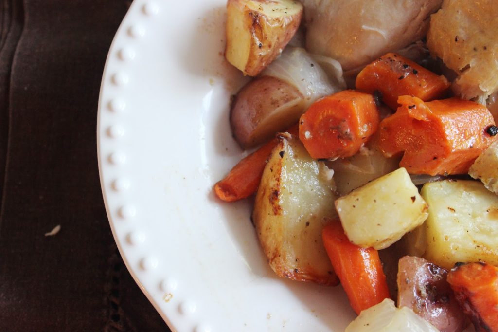 Our house loves roasted chicken. This classic one-dish meal is simple to prep, pretty to look at, and even more delicious to taste. The garlic and lemon create a light sauce that perfectly seasons the vegetables and keeps the chicken moist and savory.