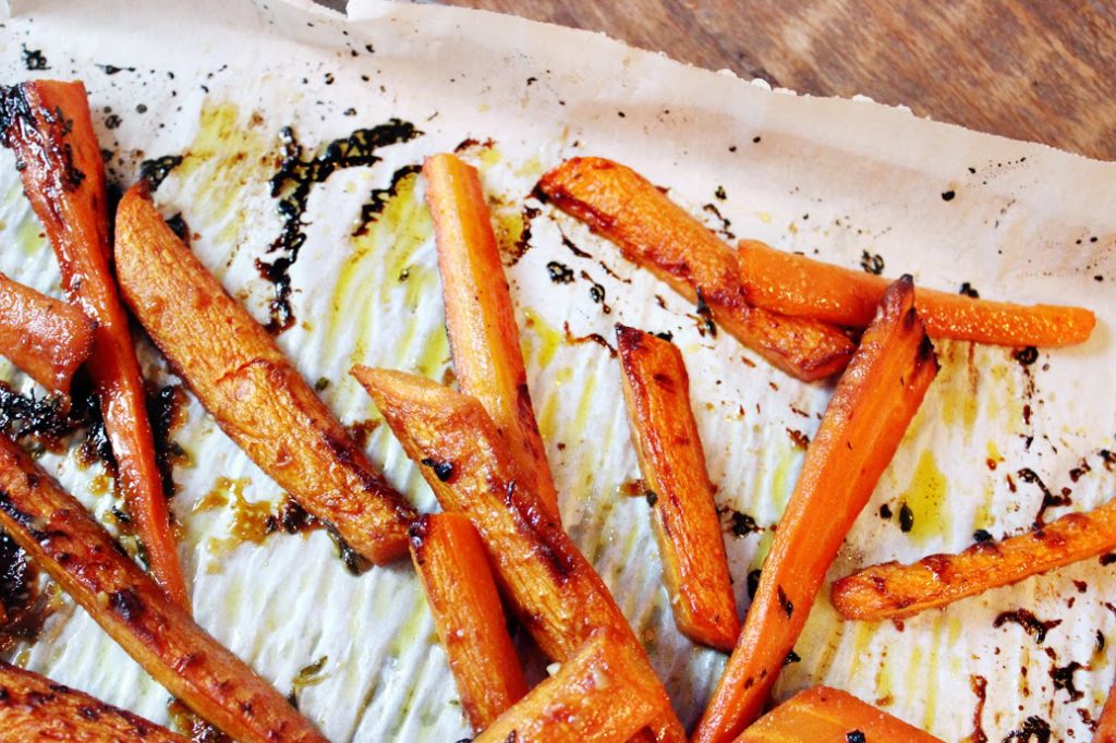 Line a shallow baking dish with parchments paper. Spread out the carrots onto the baking sheet in one even layer.