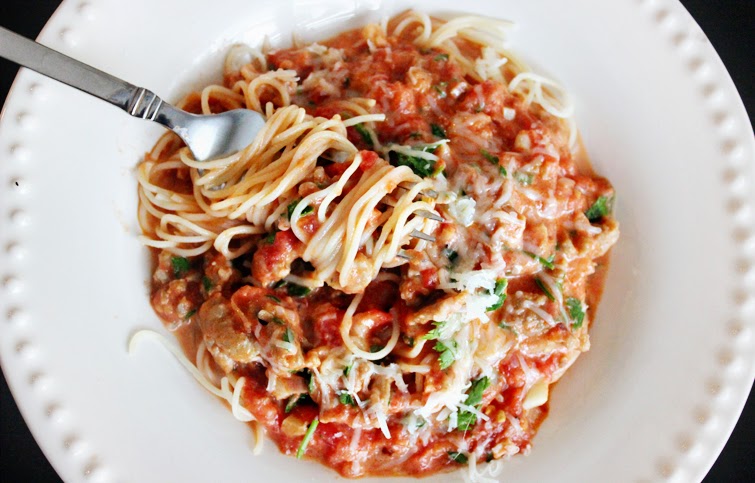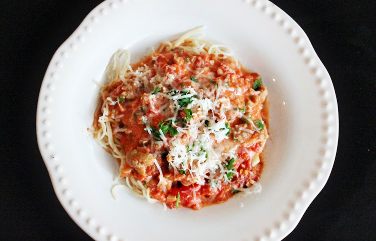 To be honest, we don’t eat a ton of pasta in our house. Okay, well, I don’t eat a ton of pasta in our house. Mat, however, would eat pasta with just butter, salt, and grated parmesan cheese almost every night of the week.Recipe: Angel Hair Pasta with Spicy Creamy Tomato Sauce…and Italian Sausage